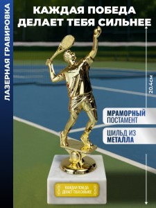 Лазерная гравировка нанесена на табличку (шильд), приклеенную к подставке. Размер: 20.4 x 6.5 x 6.5 см. Высота статуэтки без постамента: 17.4 см. Размер мраморной подставки: 6.5 x 6.5 x 3 см. Размер шильдика: 5 x 1.7 см. Материалы: Пластик (фигурка), Мрамор (постамент). Вес: 363 г. Упаковка: Картонная коробка. Наградная статуэтка с тематическим оформлением для теннисных турниров и спортивных мероприятий. Фигура теннисиста предназначена для размещения в интерьере спортивных залов, клубов и в коллекциях призов. Сувенир станет отличной памятной наградой за заслуги или победы, подходит как взрослым мужчинам (папе, дедушке, руководителю и начальнику) так и молодым парням (сыну подростку, брату, другу, любимому). Также актуально в качестве подарка и для взрослых женщин (маме, бабушке, коллеге, начальнице) или юным девушкам (дочери, сестре, подруге или любимой) Идеальный презент теннисисту-профессионалу, виртуозу ракетки, игроку, ракетчику - к Всемирному дню тенниса, турниру, юбилею или победе на корте. Подойдёт спортсмену-любителю или профессионалу и чемпиону - как знак признания мастерства и упорства. 1785