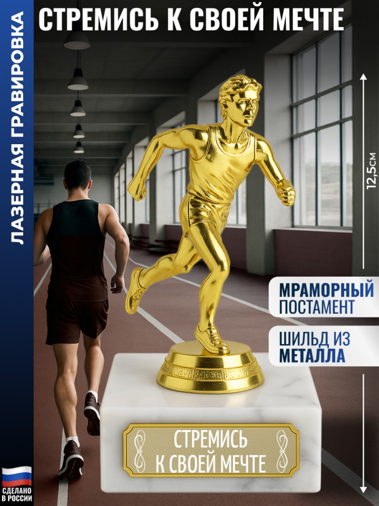 Призой кубок с бегуном олицетворяет успех и достижение, станет предметом гордости лучшего стайера, спринтера барьериста, марафонца или бегуна. Достойная награда для самого скоростного и талантливого легкоатлета.