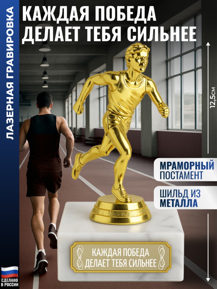 Призой кубок с бегуном олицетворяет успех и достижение, станет предметом гордости лучшего стайера, спринтера барьериста, марафонца или бегуна. Достойная награда для самого скоростного и талантливого легкоатлета.