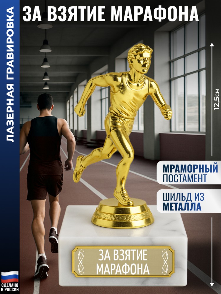 Призой кубок с бегуном олицетворяет успех и достижение, станет предметом гордости лучшего стайера, спринтера барьериста, марафонца или бегуна. Достойная награда для самого скоростного и талантливого легкоатлета.