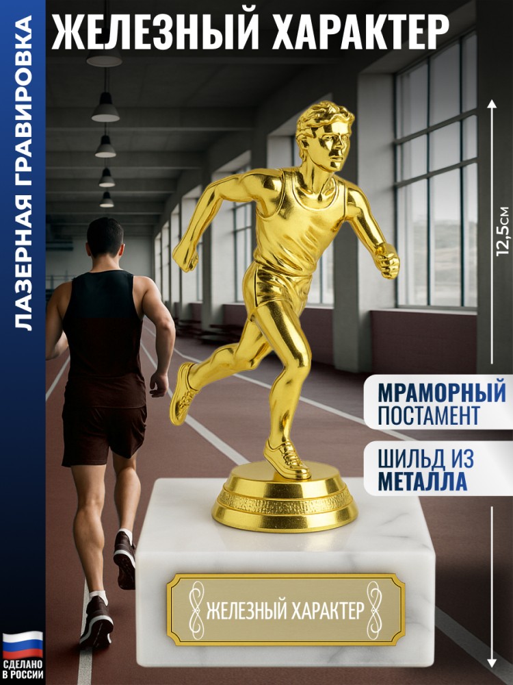Призой кубок с бегуном олицетворяет успех и достижение, станет предметом гордости лучшего стайера, спринтера барьериста, марафонца или бегуна. Достойная награда для самого скоростного и талантливого легкоатлета.
