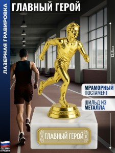 Призой кубок с бегуном олицетворяет успех и достижение, станет предметом гордости лучшего стайера, спринтера барьериста, марафонца или бегуна. Достойная награда для самого скоростного и талантливого легкоатлета.