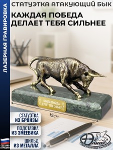 Размер: 15 x 7 x 7 см. Материал: Бронза, Натуральный камень (змеевик). Лазерная гравировка нанесена на металлическую табличку (шильдик: 5 х 1,7 см), приклеенную к подставке. Примечание: Ручная работа. Не является копией знаменитого быка с Уолл-стрит. Страна производства: Россия. Упаковка: Картонная коробка. Вес: 880 граммов. Отделка: патинирование. Наградная статуэтка с атакующим быком символизирует силу и решимость, станет центром внимания в любом интерьере и достойным признанием сильной личности. Сувенир олицетворяет связь с ареной и корридой, подчеркивает борьбу, азарт и дух соперничества. Фигурка уместна как знак финансовой хватки, роста и упорства в достижении целей. Оригинальный подарок, который подойдет на любой праздник или награждение. Он станет достойной памятной наградой за победы и достижения от коллектива на память. Сувенир символизирует не только личные успехи, но и благодарность за труд и преданность делу. Актуально в качестве новогоднего сюрприза жене, мужу, отцу, взрослым родственникам, коллегам, преподавателю или юбиляру. Такая сувенирная красивая продукция и атрибутика подходит для множества знаковых дат и событий дома и в офисе, таких как юбилеи родителей, международный женский день (8 марта), 23 и 14 февраля, Новый год, день рождения (ДР) и другие торжества. Считается хорошим корпоративным подарком как для мужчин (папе, дедушке, руководителю, сыну подростку, брату, другу, любимому парню, начальнику), так и для женщин (маме, бабушке, коллеге, начальнице, дочери, сестре, подруге, любимой девушке). Титул, достойный любимого мужчины-лидера. Уникальный подарок на юбилей, день рождения или ко Дню защитника Отечества (23 Февраля), который покажет искреннее признание. 15075