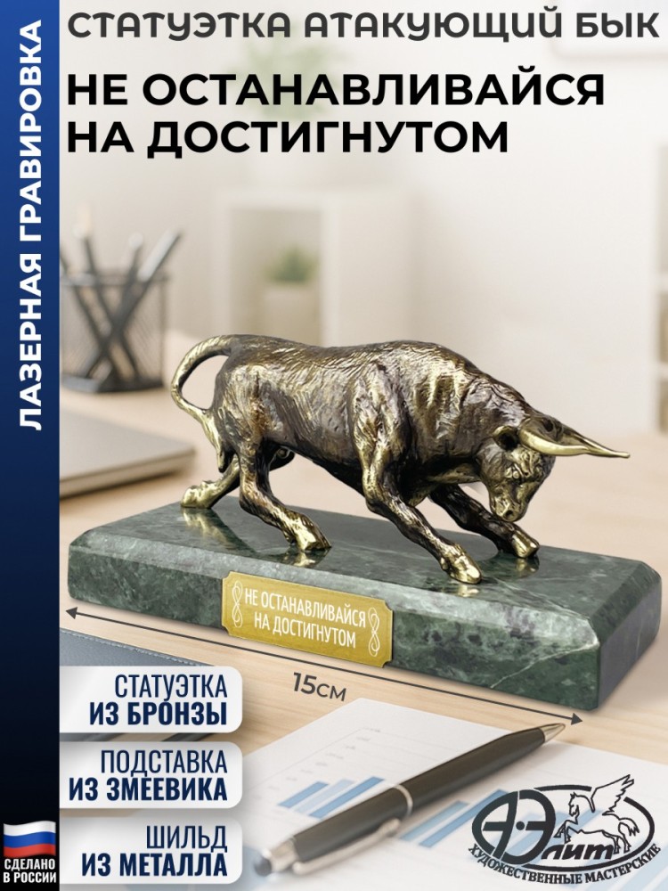 Наградная статуэтка с атакующим быком символизирует силу и решимость, станет центром внимания в любом интерьере и достойным признанием сильной личности.