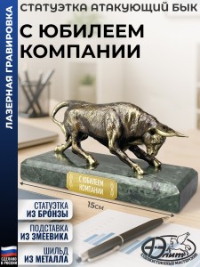 Размер: 15 x 7 x 7 см. Материал: Бронза, Натуральный камень (змеевик). Лазерная гравировка нанесена на металлическую табличку (шильдик: 5 х 1,7 см), приклеенную к подставке. Примечание: Ручная работа. Не является копией знаменитого быка с Уолл-стрит. Страна производства: Россия. Упаковка: Картонная коробка. Вес: 880 граммов. Отделка: патинирование. Наградная статуэтка с атакующим быком символизирует силу и решимость, станет центром внимания в любом интерьере и достойным признанием сильной личности. Сувенир олицетворяет связь с ареной и корридой, подчеркивает борьбу, азарт и дух соперничества. Фигурка уместна как знак финансовой хватки, роста и упорства в достижении целей. Оригинальный подарок, который подойдет на любой праздник или награждение. Он станет достойной памятной наградой за победы и достижения от коллектива на память. Сувенир символизирует не только личные успехи, но и благодарность за труд и преданность делу. Актуально в качестве новогоднего сюрприза жене, мужу, отцу, взрослым родственникам, коллегам, преподавателю или юбиляру. Такая сувенирная красивая продукция и атрибутика подходит для множества знаковых дат и событий дома и в офисе, таких как юбилеи родителей, международный женский день (8 марта), 23 и 14 февраля, Новый год, день рождения (ДР) и другие торжества. Считается хорошим корпоративным подарком как для мужчин (папе, дедушке, руководителю, сыну подростку, брату, другу, любимому парню, начальнику), так и для женщин (маме, бабушке, коллеге, начальнице, дочери, сестре, подруге, любимой девушке). С юбилеем — значимая дата, которая подчёркивает важность пройденного пути и достижений. 15075