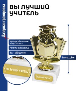 Лазерная гравировка наносится на табличку (шильд), приклеенную к подставке. Размер: 13,8 x 10 x 6,5 см. Высота фигурки: 12 см. Размер мраморного постамента: 6,5 x 6,5 x 3 см. Размер шильдика (таблички с надписью): 5 x 1,7 см. Материалы: пластик (фигурка), мрамор (постамент). Вес: 386 граммов. Упаковка: картонная коробка. Наградная статуэтка «Учёная сова» - подходит для вручения призов на образовательных и научных мероприятиях, а также для оформления интерьеров кабинетов и библиотек. Идеальный подарок учителю любого уровня образования - от педагога начальных классов до преподавателя старшеклассников. Порадует классного руководителя, наставника и учительницу (в школе или учебном заведении). Особенный выбор для важных школьных событий: выпускной, последний звонок, 1 сентября или День учителя (5 октября). Подойдет для выражения благодарности от выпускника училища, ученика школы или целого класса и их родителей (родительский комитет). Универсальное решение для признания заслуг в образовании и обучении. Оценят как опытный педагог или репетитор с многолетним стажем, так и молодой преподаватель-наставник, работающий с младшеклассниками. Станет памятным презентом для всех, кто связан с передачей знаний и воспитанием. Поможет выразить искреннюю признательность любимой учительнице - от благодарных учеников до коллег. Красивый способ отметить вклад лучшего педагога в школьный праздник или учебный процесс техникума, в том числе и в гимназии, академии, колледже или лицее. 2265