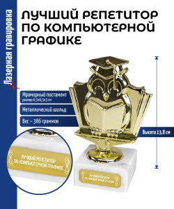Лазерная гравировка наносится на табличку (шильд), приклеенную к подставке. Размер: 13,8 x 10 x 6,5 см. Высота фигурки: 12 см. Размер мраморного постамента: 6,5 x 6,5 x 3 см. Размер шильдика (таблички с надписью): 5 x 1,7 см. Материалы: пластик (фигурка), мрамор (постамент). Вес: 386 граммов. Упаковка: картонная коробка. Наградная статуэтка «Учёная сова» - подходит для вручения призов на образовательных и научных мероприятиях, а также для оформления интерьеров кабинетов и библиотек. Оригинальный подарок на любой праздник или награждение. Он станет достойной памятной наградой за победы и достижения от коллектива на память. Символизирует не только личные успехи, но и благодарность за труд и преданность делу. Актуально в качестве новогоднего сюрприза жене, мужу, отцу, взрослым родственникам (папе, дедушке, маме, бабушке), коллегам (начальнику), преподавателю или юбиляру. Такой красивый сувенир подходит для множества знаковых дат и событий дома и в офисе, на юбилеи родителей, международный женский день (8 марта), 14 и 23 февраля, Новый год или день рождения (ДР). Считается хорошим корпоративным подарком как для мужчин (сыну, брату, другу, любимому парню, руководителю), так и для женщин (начальнице, дочери, сестре, подруге или девушке). Репетитор помогает освоить сложные темы и углубить знания в выбранной области. Услуги такого специалиста актуальны как для школьников, так и для студентов. Лучший репетитор учитывает индивидуальные особенности ученика, подбирая оптимальный формат занятий. 2265