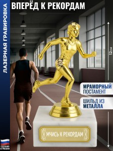 Наградная статуэтка с фигуркой бегуньи предназначена для спортивных соревнований по лёгкой атлетике. Используется как приз в индивидуальных дисциплинах: спринте, марафоне, беге с препятствиями.