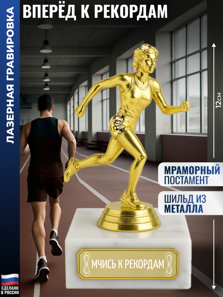Фигура легкоатлетки актуальна для секций по спорту, школьных мероприятий и клубных турниров. Трофей подойдёт для награждения за призовые места, личные рекорды и участие в забегах на различные дистанции.