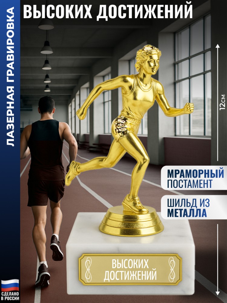 Фигура легкоатлетки актуальна для секций по спорту, школьных мероприятий и клубных турниров. Трофей подойдёт для награждения за призовые места, личные рекорды и участие в забегах на различные дистанции.