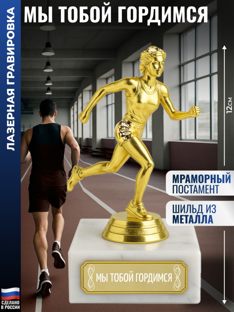 Фигура легкоатлетки актуальна для секций по спорту, школьных мероприятий и клубных турниров. Трофей подойдёт для награждения за призовые места, личные рекорды и участие в забегах на различные дистанции.