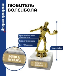 Наградная статуэтка с фигурой волейболиста на подставке. Подходит для размещения в интерьерах спортивных залов и коллекциях призовых трофеев.