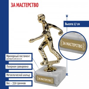 Лазерная гравировка нанесена на табличку (шильд), приклеенную к подставке. Размер: 17 x 6,5 x 6,5 см. Высота статуэтки без постамента: 14 см. Размер мраморной подставки: 6,5 x 6,5 x 3 см. Размер шильдика: 5 x 1,7 см. Материал: Пластик (фигурка), Мрамор (постамент). Вес: 350гр. Упаковка: Картонная коробка. Наградная статуэтка с фигуркой игрока в боулинг на мраморном основании. Подходит для размещения в интерьерах спортивных клубов и коллекций трофеев. Оригинальный подарок на любой праздник или награждение. Он станет достойной памятной наградой за победы и достижения от коллектива на память. Символизирует не только личные успехи, но и благодарность за труд и преданность делу. Актуально в качестве новогоднего сюрприза жене, мужу, отцу, взрослым родственникам (папе, дедушке, маме, бабушке), коллегам (начальнику), преподавателю или юбиляру. Такой красивый сувенир подходит для множества знаковых дат и событий дома и в офисе, на юбилеи родителей, международный женский день (8 марта), 14 и 23 февраля, Новый год или день рождения (ДР). Считается хорошим корпоративным подарком как для мужчин (сыну, брату, другу, любимому парню, руководителю), так и для женщин (начальнице, дочери, сестре, подруге или девушке). Боулинг - популярный вид спорта и активного отдыха, сочетающий в себе физическую активность и азарт. Подходит для людей любого возраста и уровня подготовки. 1785