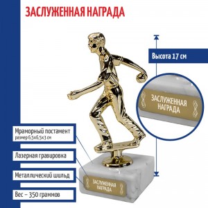 Лазерная гравировка нанесена на табличку (шильд), приклеенную к подставке. Размер: 17 x 6,5 x 6,5 см. Высота статуэтки без постамента: 14 см. Размер мраморной подставки: 6,5 x 6,5 x 3 см. Размер шильдика: 5 x 1,7 см. Материал: Пластик (фигурка), Мрамор (постамент). Вес: 350гр. Упаковка: Картонная коробка. Наградная статуэтка с фигуркой игрока в боулинг на мраморном основании. Подходит для размещения в интерьерах спортивных клубов и коллекций трофеев. Оригинальный подарок на любой праздник или награждение. Он станет достойной памятной наградой за победы и достижения от коллектива на память. Символизирует не только личные успехи, но и благодарность за труд и преданность делу. Актуально в качестве новогоднего сюрприза жене, мужу, отцу, взрослым родственникам (папе, дедушке, маме, бабушке), коллегам (начальнику), преподавателю или юбиляру. Такой красивый сувенир подходит для множества знаковых дат и событий дома и в офисе, на юбилеи родителей, международный женский день (8 марта), 14 и 23 февраля, Новый год или день рождения (ДР). Считается хорошим корпоративным подарком как для мужчин (сыну, брату, другу, любимому парню, руководителю), так и для женщин (начальнице, дочери, сестре, подруге или девушке). Боулинг - популярный вид спорта и активного отдыха, сочетающий в себе физическую активность и азарт. Подходит для людей любого возраста и уровня подготовки. 1785