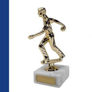Наградная статуэтка с фигуркой игрока в боулинг на мраморном основании. Подходит для размещения в интерьерах спортивных клубов и коллекций трофеев.