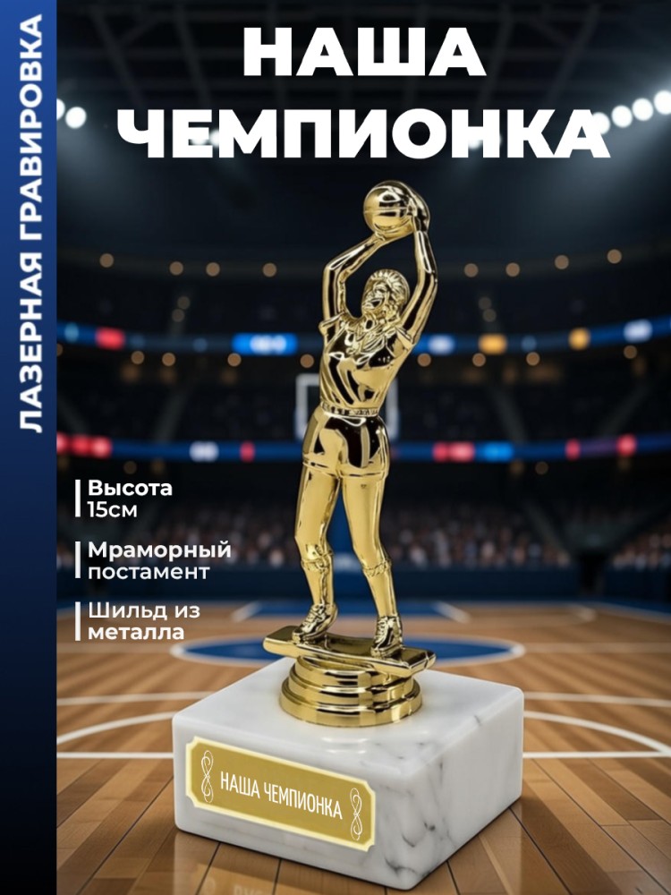 Лазерная гравировка нанесена на металлическую табличку, приклеенную к подставке. Размер: 15х6,5х6,5см. Высота фигурки без постамента: 12см. Высота с постаментом: 15см. Постамент: 6,5х6,5х3см. Размер шильдика (таблички): 5х1,7см. Материал: Пластик (фигурка), Мрамор (постамент). Вес: 347гр. Упаковка: Белая картонная коробка. Наградной кубок с баскетболисткой используется для награждения призёров на массовых мероприятиях и праздниках или за участие в соревнованиях. Фигурка может быть подарком преподавателю, учителю или тренеру, чтобы отметить их заслуги в развитии спортивного духа и мастерства спортсменов. Подходит для мероприятий по награждению: за высокую эффективность бросков, уверенную технику или стойкость, что делает статуэтку замечательным премированием для призеров любых матчей и состязаний, включая чемпионаты юниоров, премьер-лиги, первенства и другие значимые победы. Сувенир станет отличной памятной наградой за заслуги или победы, подходит как взрослым мужчинам (папе, дедушке, руководителю и начальнику) так и молодым парням (сыну подростку, брату, другу, любимому). Также актуально в качестве подарка и для взрослых женщин (маме, бабушке, коллеге, начальнице) или юным девушкам (дочери, сестре, подруге или любимой) Неважно, новенький участник спортивной команды или профессиональный член баскетбольного клуба, каждому баскетболисту подойдет памятный сувенир, отражающий вклад в победу и подчеркивающий виртуозность его броска. Сувенир для баскетболиста, мастера мяча и кольца - к спортивному достижению, началу карьеры, юбилею игры, в знак поддержки или на день рождения. 1785