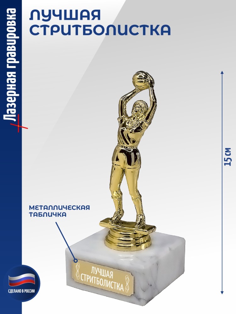 Наградной кубок с баскетболисткой используется для награждения призёров на массовых мероприятиях и праздниках или за участие в соревнованиях.