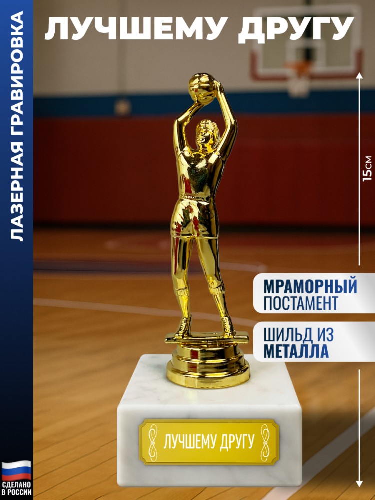 Лазерная гравировка нанесена на металлическую табличку, приклеенную к подставке. Размер: 15х6,5х6,5см. Высота фигурки без постамента: 12см. Высота с постаментом: 15см. Постамент: 6,5х6,5х3см. Размер шильдика (таблички): 5х1,7см. Материал: Пластик (фигурка), Мрамор (постамент). Вес: 343гр. Упаковка: Белая картонная коробка. Награда для всех любителей баскетбола. Наградной кубок с баскетболистом используется для награждения призёров на массовых мероприятиях и праздниках или за участие в соревнованиях. Такая фигурка будет хорошо смотреться на наградной полке. Оригинальный подарок на любой праздник или награждение. Он станет достойной памятной наградой за победы и достижения от коллектива на память. Символизирует не только личные успехи, но и благодарность за труд и преданность делу. Актуально в качестве новогоднего сюрприза жене, мужу, отцу, взрослым родственникам (папе, дедушке, маме, бабушке), коллегам (начальнику), преподавателю или юбиляру. Такой красивый сувенир подходит для множества знаковых дат и событий дома и в офисе, на юбилеи родителей, международный женский день (8 марта), 14 и 23 февраля, Новый год или день рождения (ДР). Считается хорошим корпоративным подарком как для мужчин (сыну, брату, другу, любимому парню, руководителю), так и для женщин (начальнице, дочери, сестре, подруге или девушке). Тренер - это специалист, который помогает достигать высоких результатов в разных видах спорта и фитнеса. Уместен как презент для тех, кто ценит профессионализм и наставничество. Лучший тренер по боевым искусствам или тренажёрному залу подчёркивает важность физического развития и дисциплины. Такой выбор актуален как для новичков, так и для опытных спортсменов. 1785