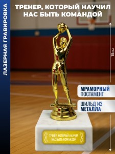 Лазерная гравировка нанесена на металлическую табличку, приклеенную к подставке. Размер: 15х6,5х6,5см. Высота фигурки без постамента: 12см. Высота с постаментом: 15см. Постамент: 6,5х6,5х3см. Размер шильдика (таблички): 5х1,7см. Материал: Пластик (фигурка), Мрамор (постамент). Вес: 343гр. Упаковка: Белая картонная коробка. Награда для всех любителей баскетбола. Наградной кубок с баскетболистом используется для награждения призёров на массовых мероприятиях и праздниках или за участие в соревнованиях. Такая фигурка будет хорошо смотреться на наградной полке. Оригинальный подарок на любой праздник или награждение. Он станет достойной памятной наградой за победы и достижения от коллектива на память. Символизирует не только личные успехи, но и благодарность за труд и преданность делу. Актуально в качестве новогоднего сюрприза жене, мужу, отцу, взрослым родственникам (папе, дедушке, маме, бабушке), коллегам (начальнику), преподавателю или юбиляру. Такой красивый сувенир подходит для множества знаковых дат и событий дома и в офисе, на юбилеи родителей, международный женский день (8 марта), 14 и 23 февраля, Новый год или день рождения (ДР). Считается хорошим корпоративным подарком как для мужчин (сыну, брату, другу, любимому парню, руководителю), так и для женщин (начальнице, дочери, сестре, подруге или девушке). Тренер - это специалист, который помогает достигать высоких результатов в разных видах спорта и фитнеса. Уместен как презент для тех, кто ценит профессионализм и наставничество. Лучший тренер по боевым искусствам или тренажёрному залу подчёркивает важность физического развития и дисциплины. Такой выбор актуален как для новичков, так и для опытных спортсменов. 1785