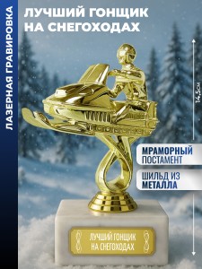 Наградная статуэтка с фигурой снегохода на подставке. Подходит для размещения в интерьерах спортивных залов и коллекциях призовых трофеев.