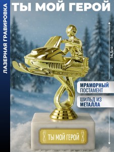 Наградная статуэтка с фигурой снегохода на подставке. Подходит для размещения в интерьерах спортивных залов и коллекциях призовых трофеев.