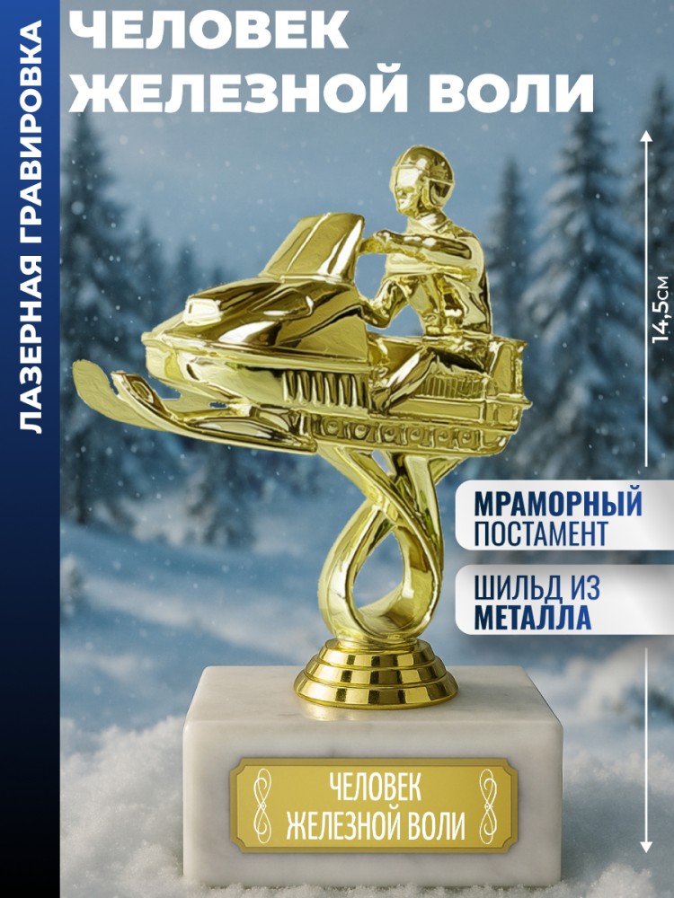 Наградная статуэтка с фигурой снегохода на подставке. Подходит для размещения в интерьерах спортивных залов и коллекциях призовых трофеев.