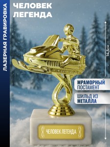 Наградная статуэтка с фигурой снегохода на подставке. Подходит для размещения в интерьерах спортивных залов и коллекциях призовых трофеев.