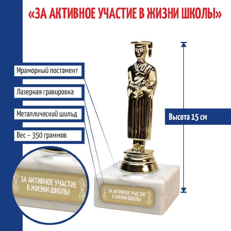 Наградная статуэтка с академическим образом подходит для вручения в образовательной сфере - от поощрения учащихся до символического признания заслуг преподавателей. Используется как сувенир на церемониях, олимпиадах и конкурсах.