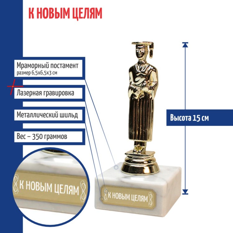 Наградная статуэтка с академическим образом подходит для вручения в образовательной сфере - от поощрения учащихся до символического признания заслуг преподавателей. Используется как сувенир на церемониях, олимпиадах и конкурсах.