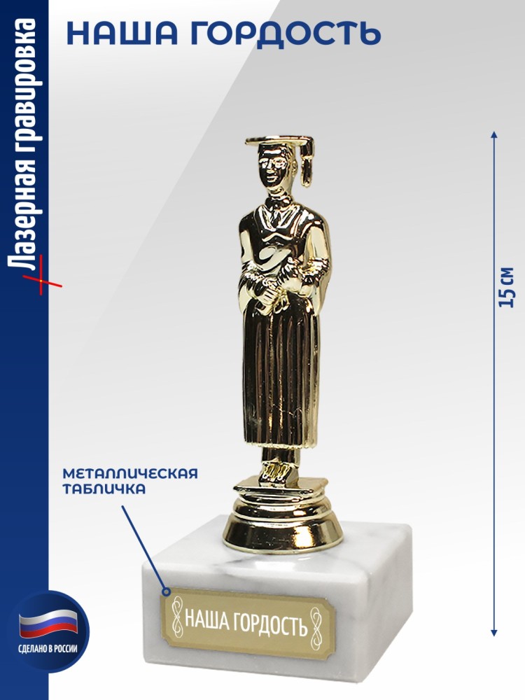 Наградная статуэтка с академическим образом подходит для вручения в образовательной сфере - от поощрения учащихся до символического признания заслуг преподавателей. Используется как сувенир на церемониях, олимпиадах и конкурсах.