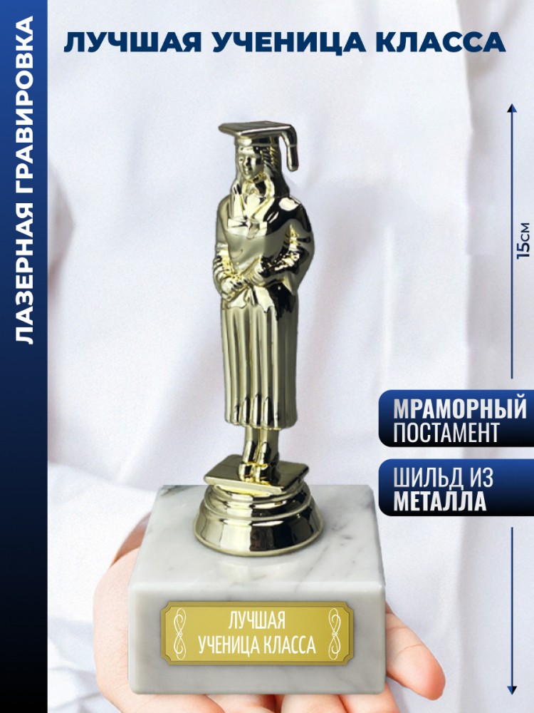 Лазерная гравировка нанесена на табличку (шильд), приклеенную к подставке. Размер: 15 x 6.5 x 6.5 см. Высота фигурки без постамента: 12 см. Размер мраморной подставки: 6.5 x 6.5 x 3 см. Размер шильдика: 5 x 1.7 см. Материалы: Пластик (фигурка), Мрамор (постамент). Вес: 350 г. Упаковка: Картонная коробка. Наградная статуэтка с женским образом на учебную тему предназначена для вручения в рамках образовательных мероприятий. Используется как трофей за успехи в обучении, конкурсах и профессиональной деятельности. Фигурка символизирует стремление к знаниям, развитие и признание достижений в педагогике или учебной среде. Подходит для оформления образовательных пространств и коллекций памятных наград. Сувенир станет отличной памятной наградой за заслуги или победы, подходит как взрослым мужчинам (папе, дедушке, руководителю и начальнику) так и молодым парням (сыну подростку, брату, другу, любимому). Также актуально в качестве подарка и для взрослых женщин (маме, бабушке, коллеге, начальнице) или юным девушкам (дочери, сестре, подруге или любимой) Ученица - это человек, который активно осваивает новые знания и навыки. Она стремится к развитию и демонстрирует усердие в учёбе. Такой статус подчёркивает целеустремлённость и готовность к обучению, что делает его важным этапом в жизни. 1935
