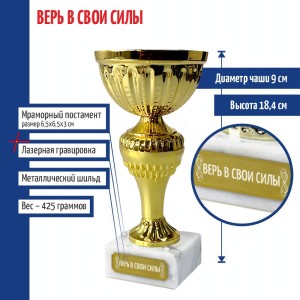 Наградной кубок используется для награждения призёров на массовых мероприятиях и праздниках или за участие в соревнованиях. Такая статуэтка будет хорошо смотреться на наградной полке.