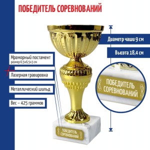 Наградной кубок используется для награждения призёров на массовых мероприятиях и праздниках или за участие в соревнованиях. Такая статуэтка будет хорошо смотреться на наградной полке.