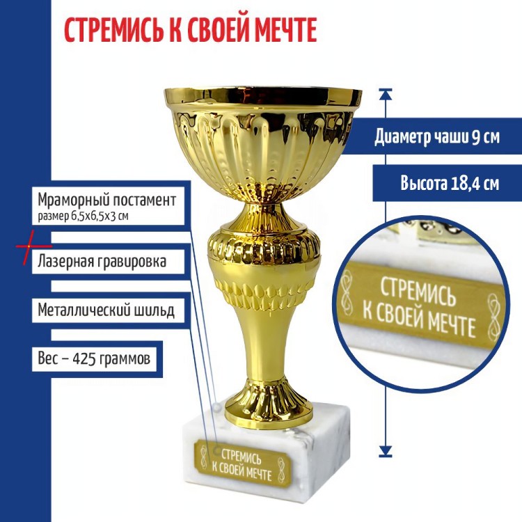Наградной кубок используется для награждения призёров на массовых мероприятиях и праздниках или за участие в соревнованиях. Такая статуэтка будет хорошо смотреться на наградной полке.