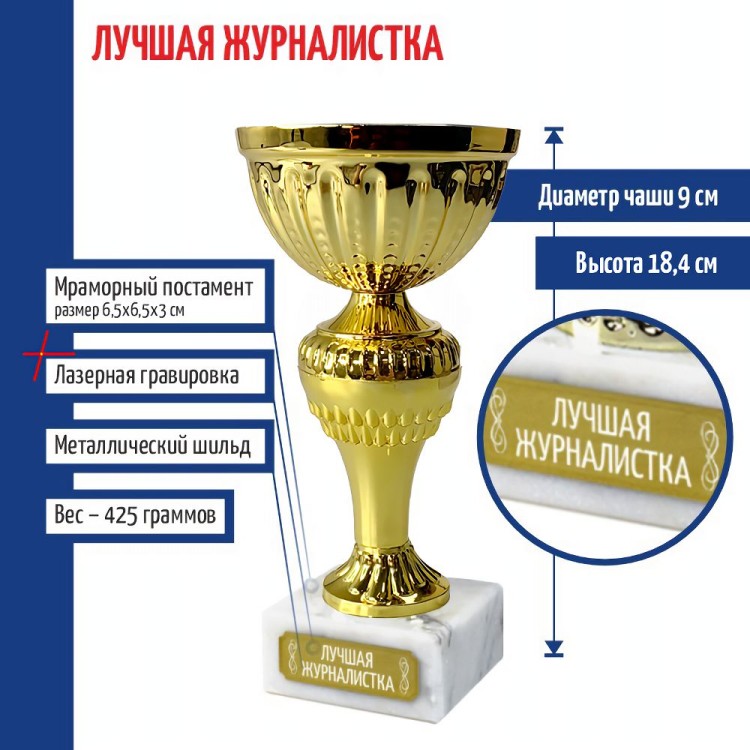 Лазерная гравировка нанесена на табличку (шильд), приклеенную к подставке. Размер: 18,4 х 9 х 9 см. Высота кубка без постамента: 15,4 см. Диаметр чаши: 9 см. Размер постамента: 6,5 х 6,5 х 3 см. Размер шильдика: 5х1,7 см. Материал: Металл (чаша), Пластик (ножка), Мрамор (постамент). Упаковка: Картонная коробка. Наградной кубок используется для награждения призёров на массовых мероприятиях и праздниках или за участие в соревнованиях. Такая статуэтка будет хорошо смотреться на наградной полке. Оригинальный подарок на любой праздник или награждение. Он станет достойной памятной наградой за победы и достижения от коллектива на память. Символизирует не только личные успехи, но и благодарность за труд и преданность делу. Актуально в качестве новогоднего сюрприза жене, мужу, отцу, взрослым родственникам (папе, дедушке, маме, бабушке), коллегам (начальнику), преподавателю или юбиляру. Такой красивый сувенир подходит для множества знаковых дат и событий дома и в офисе, на юбилеи родителей, международный женский день (8 марта), 14 и 23 февраля, Новый год или день рождения (ДР). Считается хорошим корпоративным подарком как для мужчин (сыну, брату, другу, любимому парню, руководителю), так и для женщин (начальнице, дочери, сестре, подруге или девушке). Памятный вариант для журналиста - мастера пера и актуального слова. Подходит репортёру, редактору, корреспонденту - за честность, наблюдательность и увлечённость делом. Актуален на День прессы - 13 января, за резонансный материал или вклад в медиа. 1935