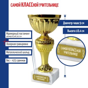 Наградной кубок используется для награждения призёров на массовых мероприятиях и праздниках или за участие в соревнованиях. Такая статуэтка будет хорошо смотреться на наградной полке.