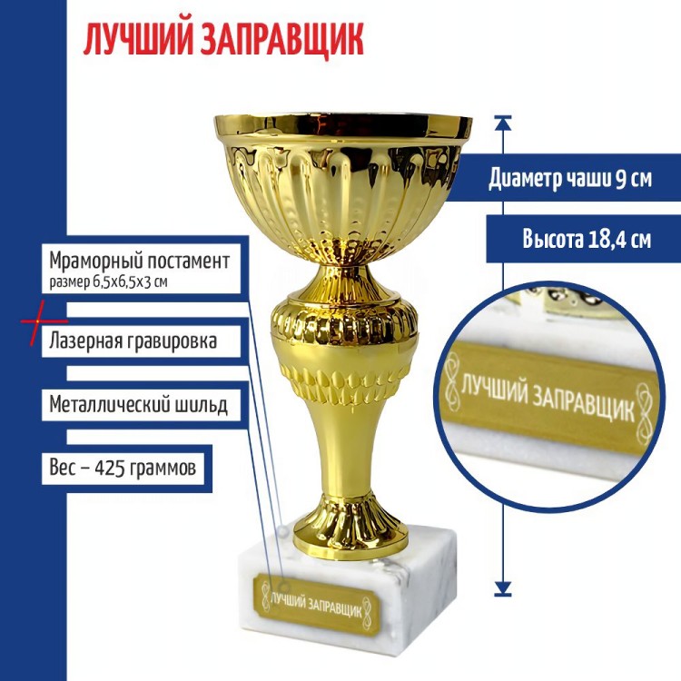 Наградной кубок используется для награждения призёров на массовых мероприятиях и праздниках или за участие в соревнованиях. Такая статуэтка будет хорошо смотреться на наградной полке.