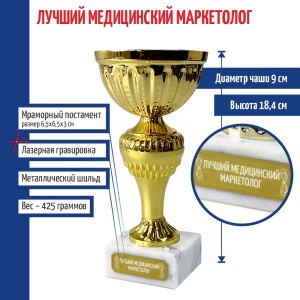 Наградной кубок используется для награждения призёров на массовых мероприятиях и праздниках или за участие в соревнованиях. Такая статуэтка будет хорошо смотреться на наградной полке.