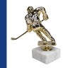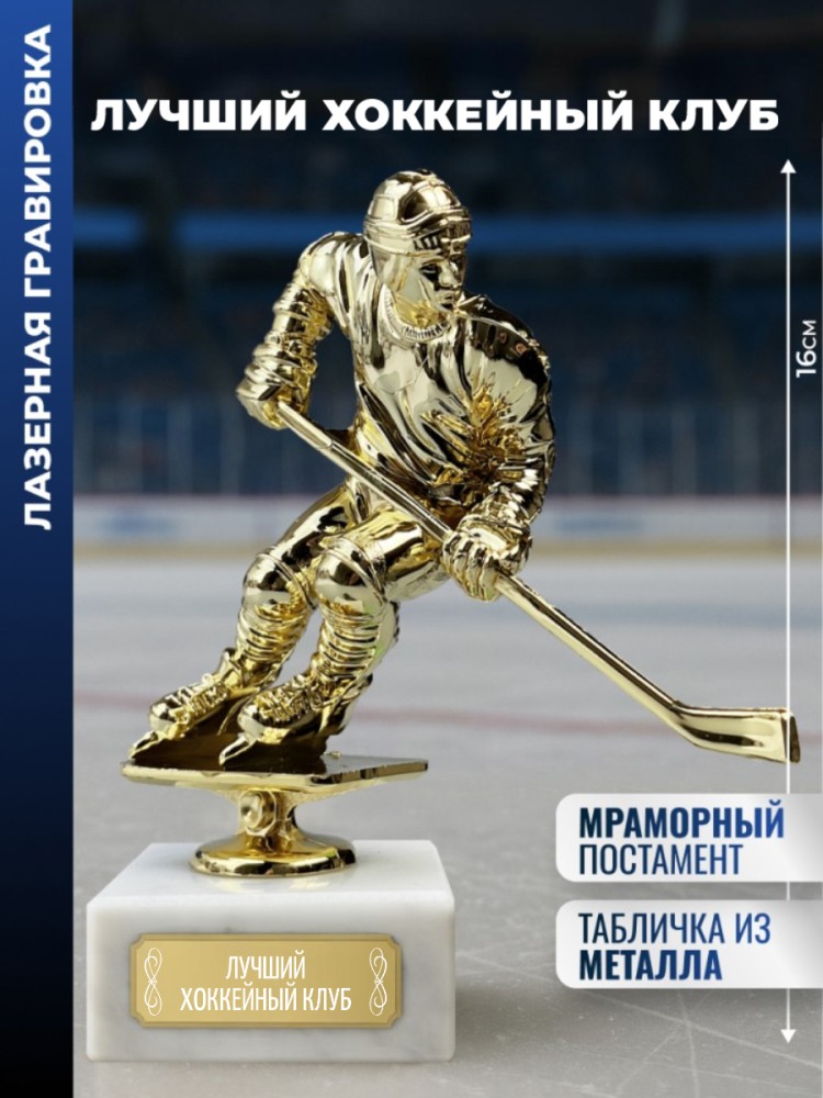 Наградная статуэтка с хоккеистом выполнена в динамичной позе с клюшкой и шлемом, что отражает характер спортивной борьбы. Форма и детали передают атмосферу ледового поединка и командного соперничества.