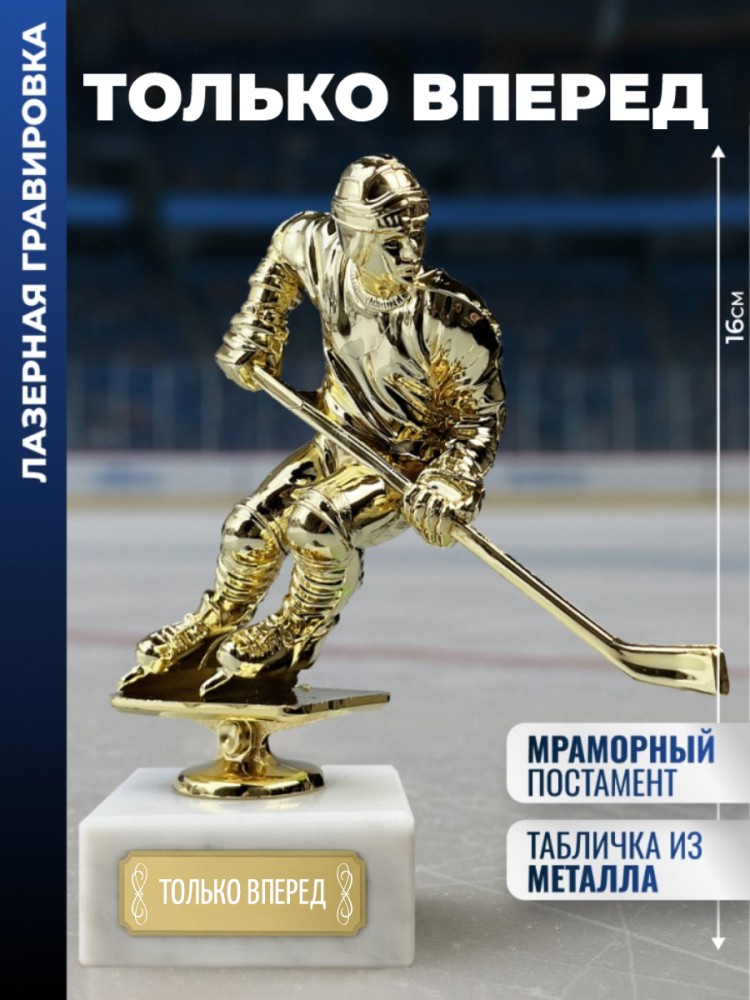 Наградная статуэтка с хоккеистом выполнена в динамичной позе с клюшкой и шлемом, что отражает характер спортивной борьбы. Форма и детали передают атмосферу ледового поединка и командного соперничества.