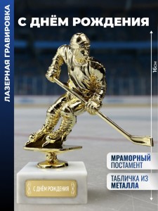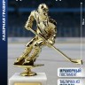 Наградная статуэтка с хоккеистом выполнена в динамичной позе с клюшкой и шлемом, что отражает характер спортивной борьбы. Форма и детали передают атмосферу ледового поединка и командного соперничества.