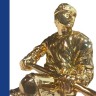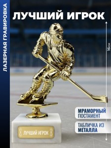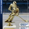 Наградная статуэтка с хоккеистом выполнена в динамичной позе с клюшкой и шлемом, что отражает характер спортивной борьбы. Форма и детали передают атмосферу ледового поединка и командного соперничества.