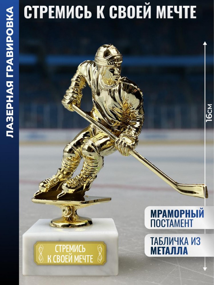 Наградная статуэтка с хоккеистом выполнена в динамичной позе с клюшкой и шлемом, что отражает характер спортивной борьбы. Форма и детали передают атмосферу ледового поединка и командного соперничества.