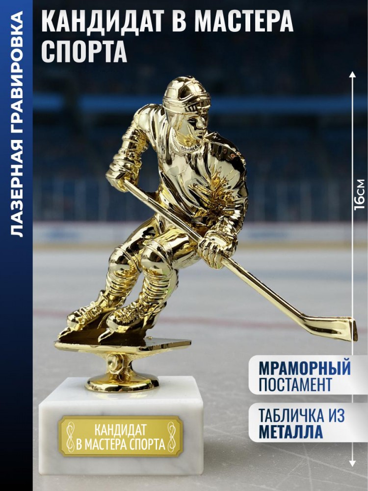 Наградная статуэтка с хоккеистом выполнена в динамичной позе с клюшкой и шлемом, что отражает характер спортивной борьбы. Форма и детали передают атмосферу ледового поединка и командного соперничества.