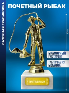 Лазерная гравировка нанесена на табличку (шильд), приклеенную к подставке. Размер: 17 x 6.5 x 6.5 см. Высота фигурки без постамента: 14 см. Размер мраморной подставки: 6.5 x 6.5 x 3 см. Размер шильдика: 5 x 1.7 см. Материалы: Пластик (фигурка), Мрамор (постамент). Вес: 360 г. Упаковка: Картонная коробка. Наградная статуэтка с фигуркой рыбака - сувенир за успехи в спортивной или любительской рыбалке. Уместна как приз на соревнованиях или дополнение к коллекции трофеев и тематических наград. Фигурка на мраморной подставке подчёркивает увлечение, мастерство и достижения в рыбной ловле. Подойдёт для оформления экспозиции или как памятный символ хобби с эстетической ценностью. Оригинальный подарок на любой праздник или награждение. Он станет достойной памятной наградой за победы и достижения от коллектива на память. Символизирует не только личные успехи, но и благодарность за труд и преданность делу. Актуально в качестве новогоднего сюрприза жене, мужу, отцу, взрослым родственникам (папе, дедушке, маме, бабушке), коллегам (начальнику), преподавателю или юбиляру. Такой красивый сувенир подходит для множества знаковых дат и событий дома и в офисе, на юбилеи родителей, международный женский день (8 марта), 14 и 23 февраля, Новый год или день рождения (ДР). Считается хорошим корпоративным подарком как для мужчин (сыну, брату, другу, любимому парню, руководителю), так и для женщин (начальнице, дочери, сестре, подруге или девушке). 1650