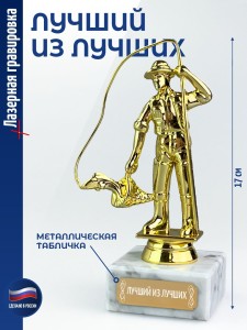 Наградная статуэтка с фигуркой рыбака - сувенир за успехи в спортивной или любительской рыбалке. Уместна как приз на соревнованиях или дополнение к коллекции трофеев и тематических наград.