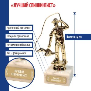 Наградная статуэтка с фигуркой рыбака - сувенир за успехи в спортивной или любительской рыбалке. Уместна как приз на соревнованиях или дополнение к коллекции трофеев и тематических наград.