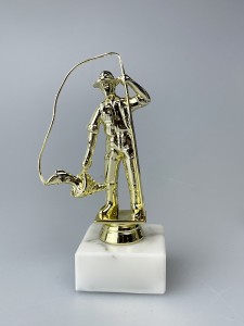 Наградная статуэтка с фигуркой рыбака - сувенир за успехи в спортивной или любительской рыбалке. Уместна как приз на соревнованиях или дополнение к коллекции трофеев и тематических наград.