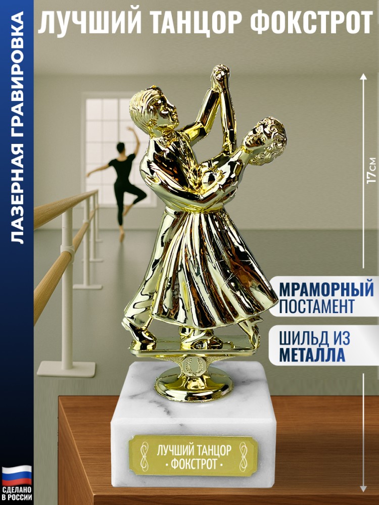 Лазерная гравировка нанесена на металлическую табличку, приклеенную к каменной подставке. Размер: 17 х 6,5 х 6,5 см. Высота фигурки: 14 см. Размер постамента: 6,5 х 6,5 х 3 см. Размер шильдика (таблички с надписью): 5 х 1,7 см. Материал: Пластик (фигура), Мрамор (постамент). Вес: 370 граммов. Упаковка: Картонная коробка. Подарочная статуэтка в виде танцующей пары - символ победы и страсти к парным танцам. Подходит для награждения как профессиональных исполнителей и педагогов, так и приз начинающим музыкантам. Сувенирная фигурка "танцевальный кубок" выполнена в золотым стиле, что делает её не только прекрасным украшением интерьера, но и отличным презентом на память. Оригинальный подарок на любой праздник или награждение. Он станет достойной памятной наградой за победы и достижения от коллектива на память. Символизирует не только личные успехи, но и благодарность за труд и преданность делу. Актуально в качестве новогоднего сюрприза жене, мужу, отцу, взрослым родственникам (папе, дедушке, маме, бабушке), коллегам (начальнику), преподавателю или юбиляру. Такой красивый сувенир подходит для множества знаковых дат и событий дома и в офисе, на юбилеи родителей, международный женский день (8 марта), 14 и 23 февраля, Новый год или день рождения (ДР). Считается хорошим корпоративным подарком как для мужчин (сыну, брату, другу, любимому парню, руководителю), так и для женщин (начальнице, дочери, сестре, подруге или девушке). Танцор - артист сцены, брейк-дансер, тангеро, чечётник, бальник - живёт в ритме и движении. К премьере, награждению или за вклад в сценическое искусство - на Международный день танца - 29 апреля. 1935