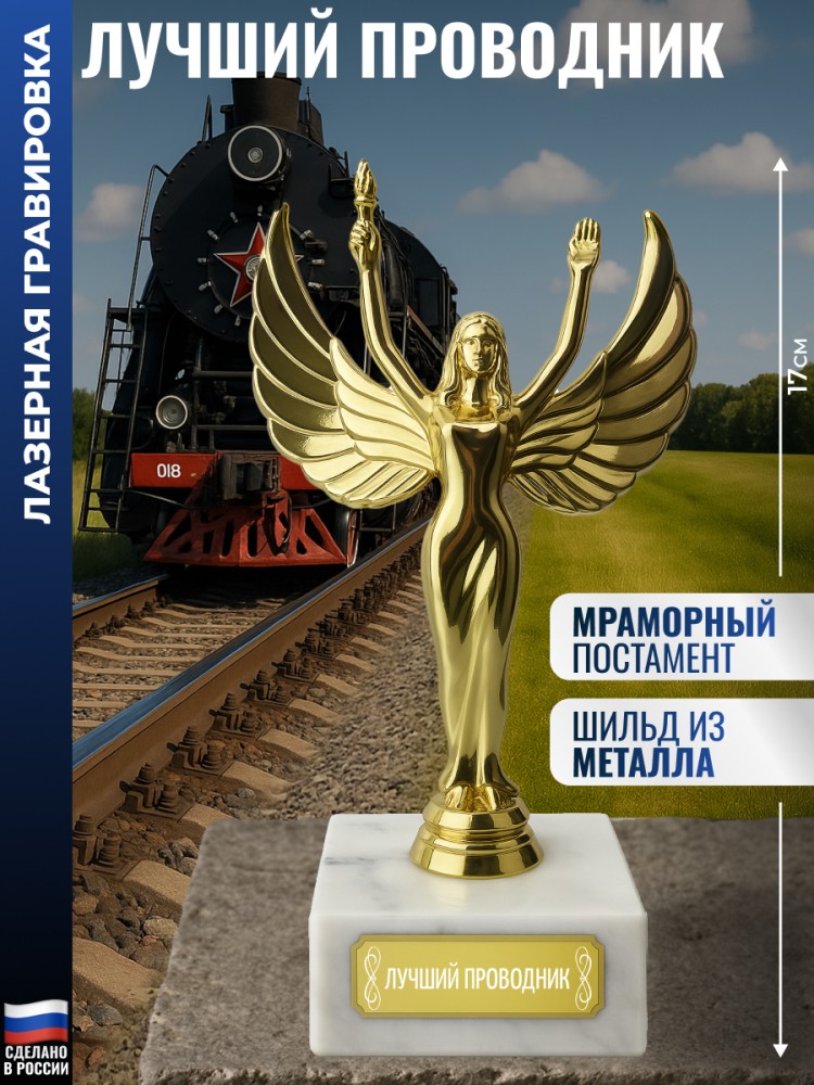 Лазерная гравировка нанесена на металлическую табличку, приклеенную к каменной подставке. Размер: 17 x 6,5 x 6,5 см. Высота фигурки: 14 см. Размер постамента: 6,5 x 6,5 x 3 см. Размер шильдика (таблички с надписью): 5 x 1,7 см. Материал: Пластик (фигурка), Мрамор (постамент). Упаковка: Белая картонная коробка. Как римская богиня Виктория символизировала победу, так и древнегреческая Ника олицетворяла триумф. Наградная статуэтка с женщиной на мраморном постаменте - символ успеха и величия. Женская фигура с грациозным обликом ангела воплощает силу и устремлённость. Она придаст неповторимую элегантность и большое значение вашему подарку. Сувенир станет отличной памятной наградой за заслуги или победы. Он подходит для корпоративных и личных наград, на юбилей или Новый год Актуально как подарок в качестве сюрприза от коллектива, друзей и близких на день рождения и другие значимые события. Символично подчеркнёт значимость профессии железнодорожника - работника, обеспечивающего бесперебойную и безопасную работу транспортной сети. Подходит машинисту, проводнику, дежурному по станции, путейцу, стрелочнику или осмотрщику. Всем, кто связан с движением, обслуживанием или ремонтом составов. Актуален ко Дню железнодорожника (в первое воскресенье августа), при вручении ведомственной награды, юбилее или выходе на пенсию. Такой подарок может выразить признание за преданность делу, вклад в развитие инфраструктуры и годы службы в отрасли. Подойдёт диспетчеру, электромонтёру, инженеру, технику, паровознику или сотруднику локомотивного депо — всем, чья работа связана с эксплуатацией, регулировкой движения и обслуживанием ЖД-комплекса. 1635
